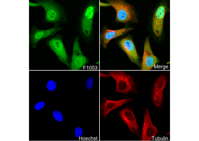 • Immunofluorescent analysis of Hela cells using F1053 (green, 1:250), Hoechst (blue) and tubulin (Red).