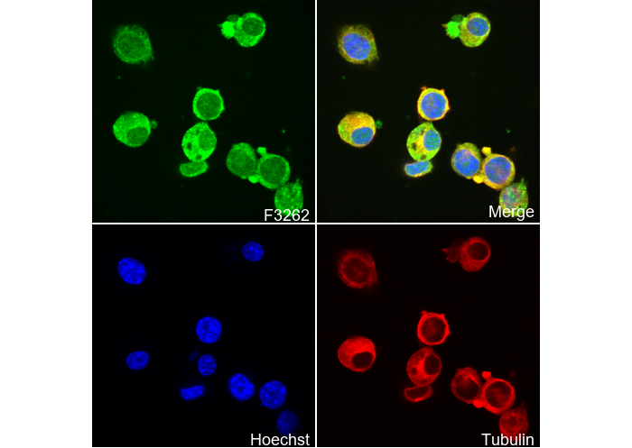 • Immunofluorescent analysis of Neuro-2a cells using F3262 (green, 1:500), Hoechst (blue) and tubulin (Red).