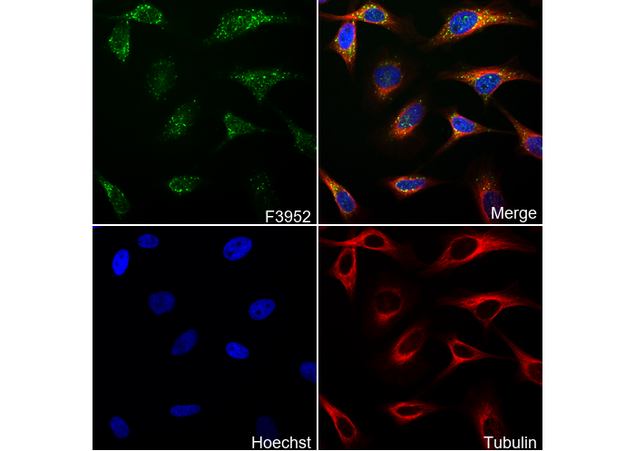 • Immunofluorescent analysis of Hela cells using F3952 (green, 1:250), Hoechst (blue) and tubulin (Red).