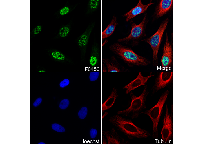 • Immunofluorescent analysis of Hela cells using F0456 (green, 1:200), Hoechst (blue) and tubulin (Red).