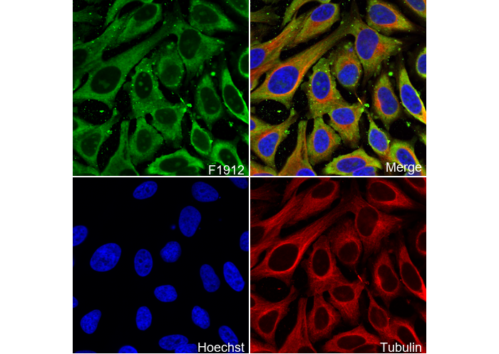 • Immunofluorescent analysis of Hela cells using F1912 (green, 1:20), Hoechst (blue) and tubulin (Red).
