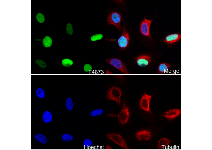 • Immunofluorescent analysis of Hela cells using F4673 (green, 1:1600), Hoechst (blue) and tubulin (Red).