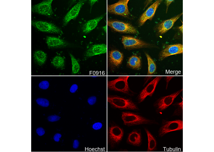 • Immunofluorescent analysis of Hela cells using F0916 (green, 1:800), Hoechst (blue) and tubulin (Red).