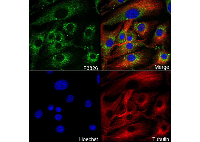 • Immunofluorescent analysis of C2C12 cells using F3826 (green, 1:500), Hoechst (blue) and tubulin (Red).