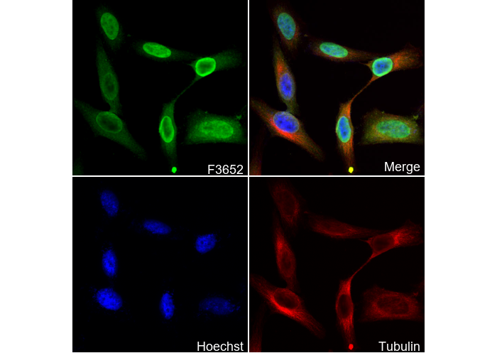 • Immunofluorescent analysis of Hela cells using F3652 (green, 1:2000), Hoechst (blue) and tubulin (Red).