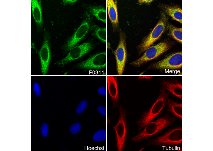 • Immunofluorescent analysis of Hela cells using F0311 (green, 1:800), Hoechst (blue) and tubulin (Red).