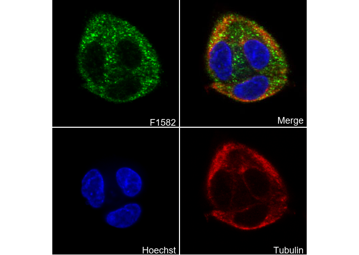 • Immunofluorescent analysis of HCT116 cells using F1582 (green, 1:50), Hoechst (blue) and tubulin (Red).
