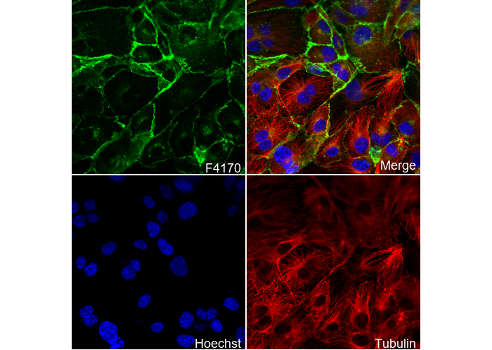 • Immunofluorescent analysis of HUVEC cells using F4170 (green, 1:400), Hoechst (blue) and tubulin (Red).
