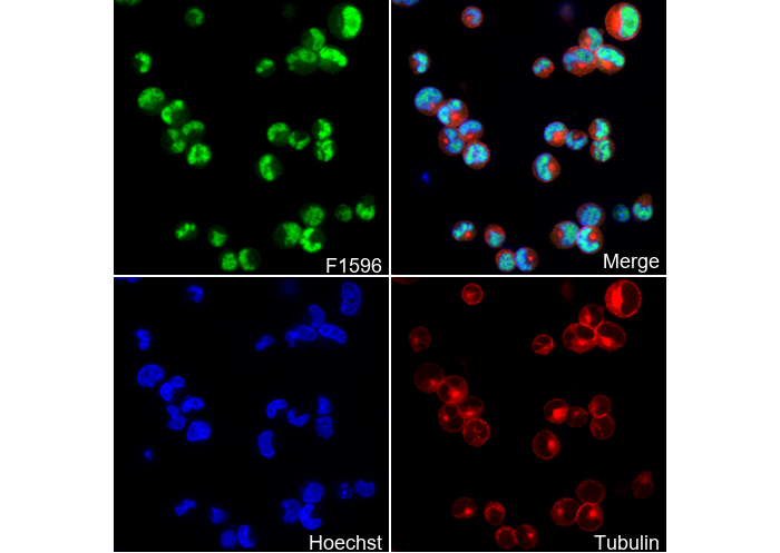 • Immunofluorescent analysis of K562 cells using F1596 (green, 1:50), Hoechst (blue) and tubulin (Red).