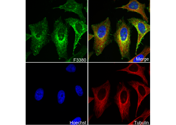 • Immunofluorescent analysis of Hela cells using F3380 (green, 1:500), Hoechst (blue) and tubulin (Red).