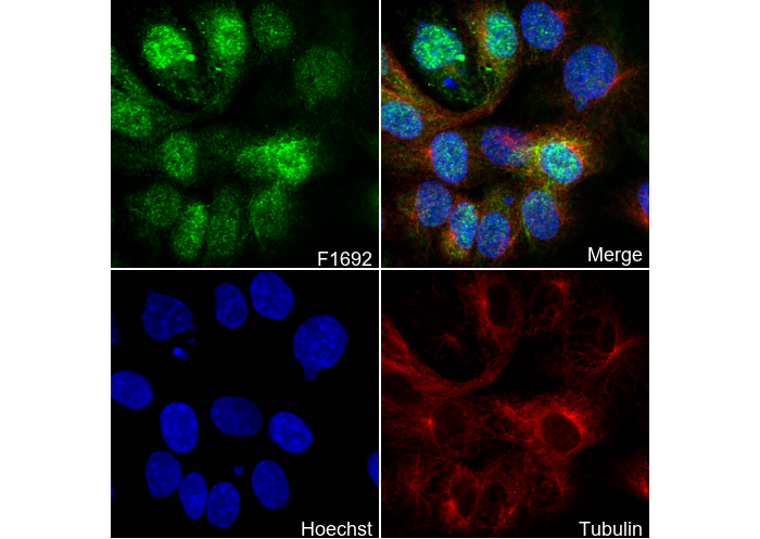 • Immunofluorescent analysis of HUVEC cells using F1692 (green, 1:500), Hoechst (blue) and tubulin (Red).