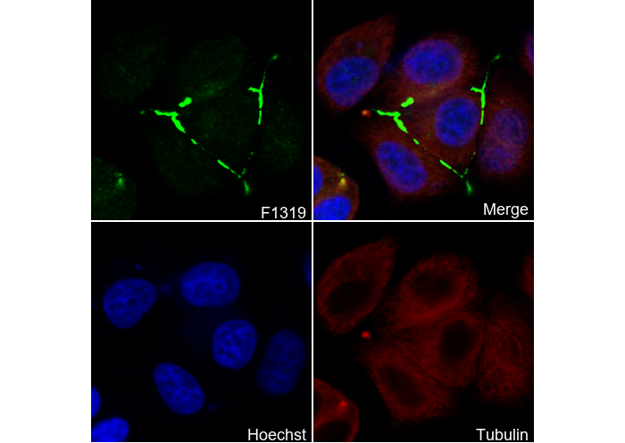 • Immunofluorescent analysis of MCF-7 cells using F1319 (green, 1:1600), Hoechst (blue) and tubulin (Red).