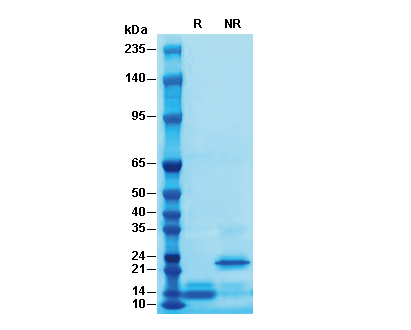 • Recombinant Human Activin A Protein, CF (HEK293)on SDS-PAGE under reducing (R) and non-reducing (NR) conditions. The gel was stained with Coomassie Blue. The purity of the protein is greater than 95%.