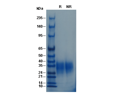• Recombinant Human IL-13 Protein (HEK293) on SDS-PAGE under reducing (R) and non-reducing (NR) conditions. The gel was stained with Coomassie Blue. The purity of the protein is greater than 95%.