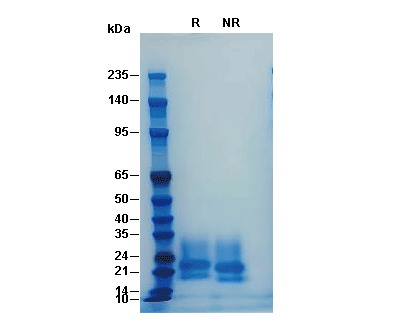 • Recombinant Mouse GM-CSF Protein (HEK293) on SDS-PAGE under reducing (R) and non-reducing (NR) conditions. The gel was stained with Coomassie Blue. The purity of the protein is greater than 95%.