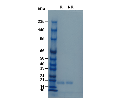 • Recombinant Mouse IL-4 Protein (HEK293) on SDS-PAGE under reducing (R) and non-reducing (NR) conditions. The gel was stained with Coomassie Blue. The purity of the protein is greater than 95%.