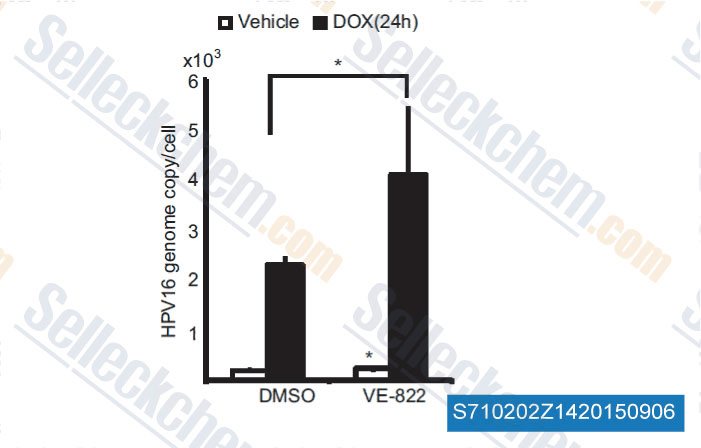| 体外研究 | 作为对XRT和LY-188011的响应,VE-822(80 nM)减弱ATR信号传导途径,并降低肿瘤细胞存活率。在正常细胞中,VE-822(80 nM)减弱ATR信号通路强度,但并没有增强辐射和LY-188011杀伤正常细胞的能力。与XRT中的MiaPaCa-2和PSN-1细胞相比,VE-822(80 nM)增加XRT引起的残余γH2AX和53BP1灶。 在XRT中的MiaPaCa-2和PSN-1细胞,VE-822(80 nM)治疗前降低Rad51的焦点。VE-822(80 nM)单独增加MiaPaCa-2和PSN-1细胞停留在G1期的比率。VE-822(80 nM)降低MiaPaCa-2和PSN-1细胞中XRT丰富G2/M-phase-fraction。 VE-822单独作用不大,而VE-822(80 nM),XRT和/或LY-188011和联用在PSN-1细胞中增强了早期和晚期的细胞凋亡。 VE-822增加了肿瘤对DNA损伤剂的反应,和pChk1 Ser345阻碍相关。 |