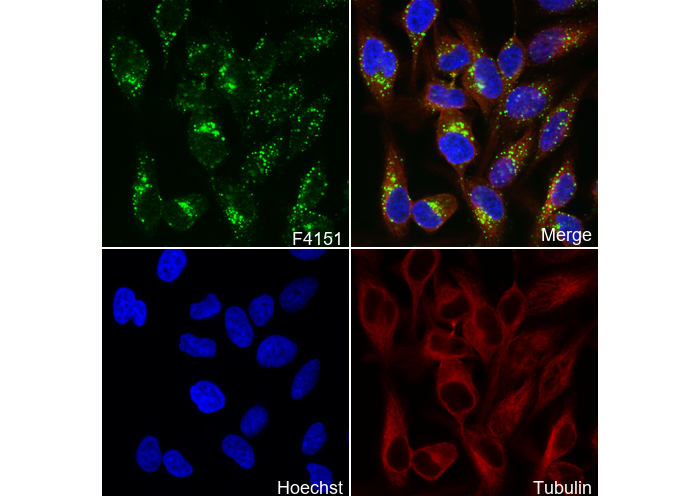 • Immunofluorescent analysis of Hela cells using F4151 (green, 1:50), Hoechst (blue) and tubulin (Red).