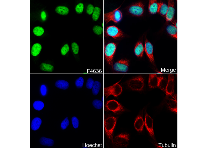 • Immunofluorescent analysis of Hela cells using F4636 (green, 1:50 ), Hoechst (blue) and tubulin (Red).