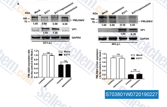 | 体外研究 | Epoxomicin共价结合到LMP7, X, MECL1,和蛋白酶体的Z催化亚基。Epoxomicin (100 nM)处理HUVECs,使p53蛋白水平增加30倍。Epoxomicin (10 μM)作用于HeLa细胞,导致泛素化蛋白累积。Epoxomicin(10 μM)作用于HeLa细胞,抑制IκBα降解。Epoxomicin(10 μM)作用于HeLa细胞,显著降低TNF-α刺激的NF-κB DNA结合活性,这种作用存在剂量依赖性。[1] Epoxomicin抑制EL4 淋巴瘤细胞增殖,IC50为4 nM。[2] Epoxomicin(1 μM) 降低LCMV GP33和增强 GP276。[3] Epoxomicin 抑制Babesia bigemina生长,IC50为4 nM。Epoxomicin按0.5 mg/kg和0.05 mg/kg剂量处理B. microti,虫血症峰值分别为34.8% 和42.3%。[4] Epoxomicin (100 nM)处理Plasmodium falciparum,降低78%, 86% 和77%虫血症。Epoxomicin (10 μM) 抑制配子和小配子形成按蚊的卵囊。[5] |