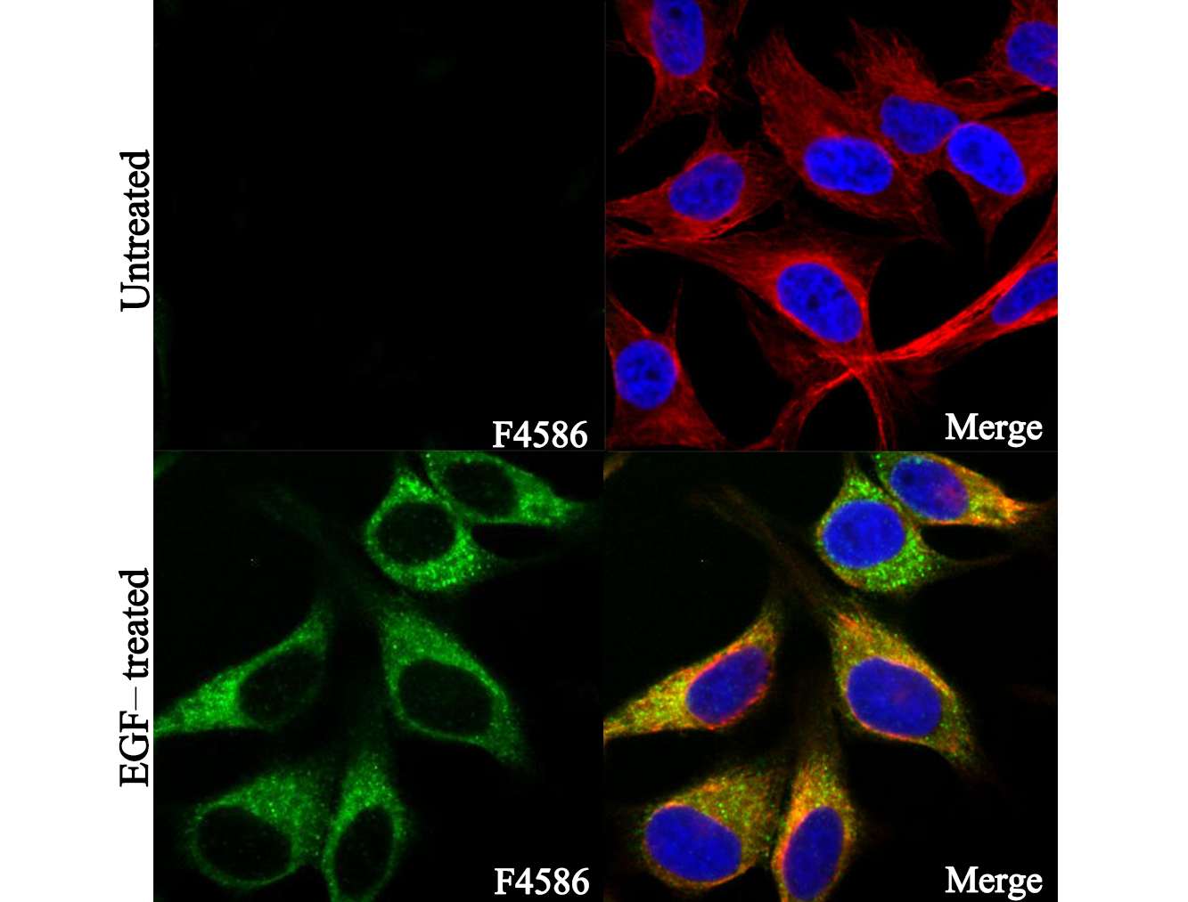 • Immunofluorescent analysis of Hela cells, untreated (upper) and EGF-treated(50 ng/mL, 15 min)(lower), using F4586 (green, 1:500), Hoechst (blue) and tubulin (Red).