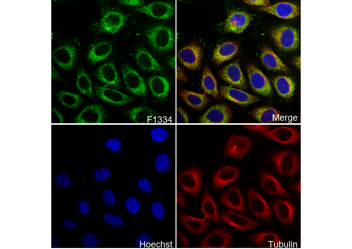 • Immunofluorescent analysis of HepG2 cells using F1334 (green, 1:200), Hoechst (blue) and tubulin (Red).