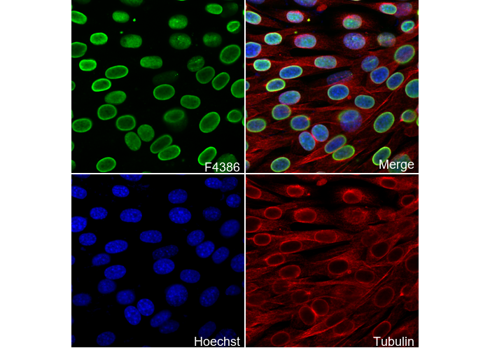 • Immunofluorescent analysis of NIH/3T3 cells using F4386 (green, 1:80), Hoechst (blue) and tubulin (Red).