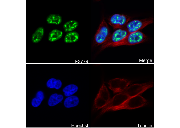 • Immunofluorescent analysis of Hela cells using F3779 (green, 1:500), Hoechst (blue) and tubulin (Red).