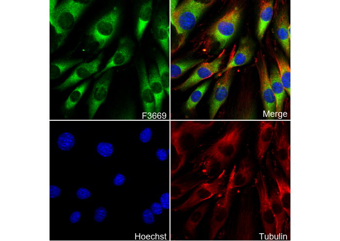 • Immunofluorescent analysis of C2C12 cells using F3669 (green, 1:50 ), Hoechst (blue) and tubulin (Red).