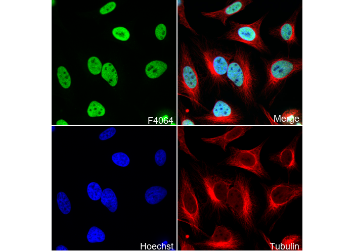• Immunofluorescent analysis of Hela cells using F4064 (green, 1:100), Hoechst (blue) and tubulin (Red).