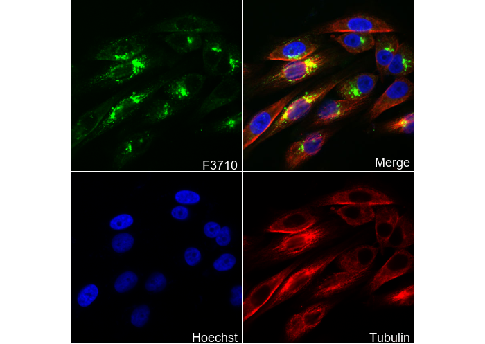 • Immunofluorescent analysis of U-87 MG cells using F3710 (green, 1:100), Hoechst (blue) and tubulin (Red).