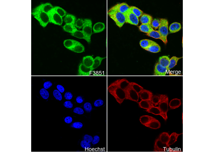 • Immunofluorescent analysis of MCF-7 cells using F3851 (green, 1:50), Hoechst (blue) and tubulin (Red).