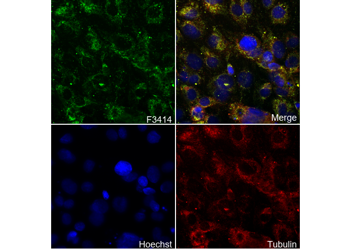 • Immunofluorescent analysis of HUVEC cells using F3414 (green, 1:100), Hoechst (blue) and tubulin (Red).