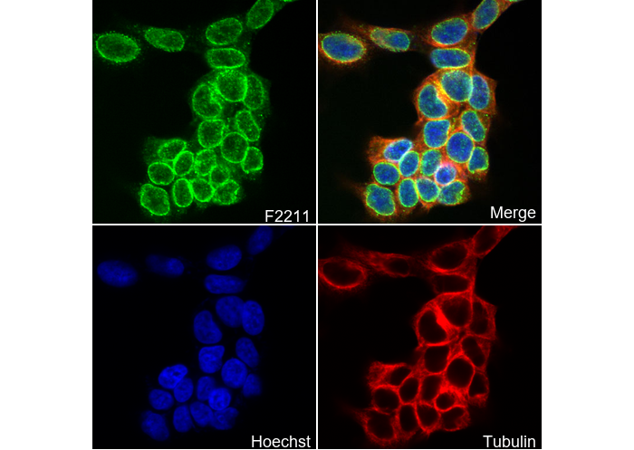 • Immunofluorescent analysis of 293T cells using F2211 (green, 1:100), Hoechst (blue) and tubulin (Red).