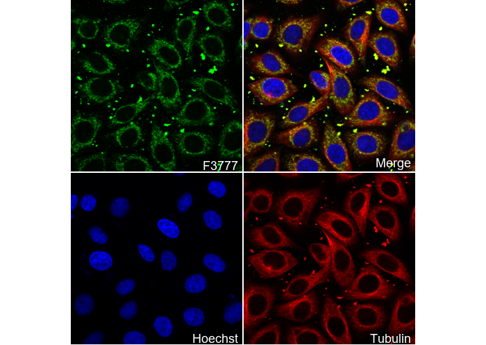 • Immunofluorescent analysis of MCF7 cells using F3777 (green, 1:2000), Hoechst (blue) and tubulin (Red).