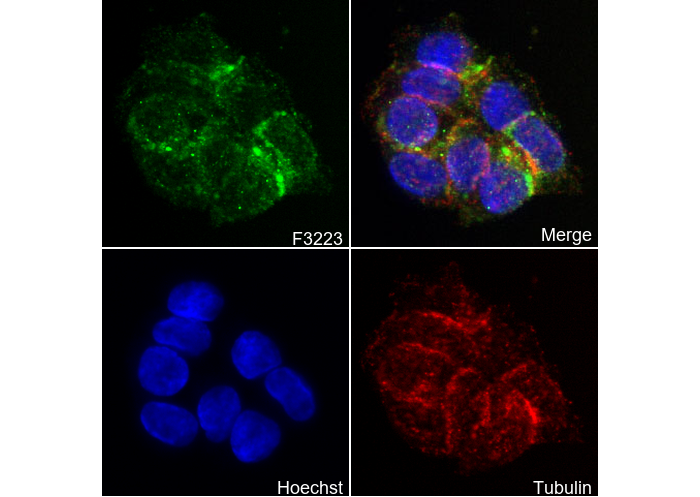 • Immunofluorescent analysis of HT-29 cells using F3223 (green, 1:250), Hoechst (blue) and tubulin (Red).