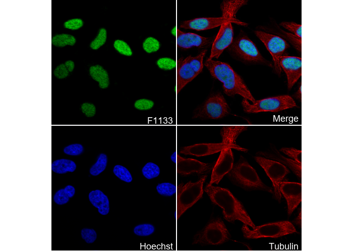 • Immunofluorescent analysis of Hela cells using F1133 (green, 1:100 ), Hoechst (blue) and tubulin (Red).
