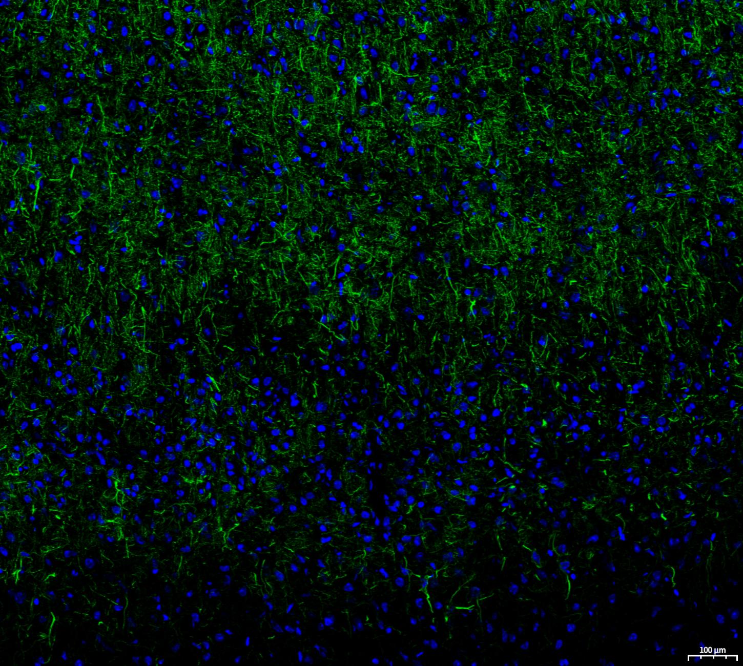 • Immunofluorescent analysis of Mouse brain tissue using F3370 (green, 1:50) and Hoechst (blue).
