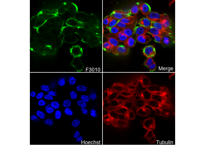 • Immunofluorescent analysis of A-375 cells using F3010 (green, 1:200), Hoechst (blue) and tubulin (Red).