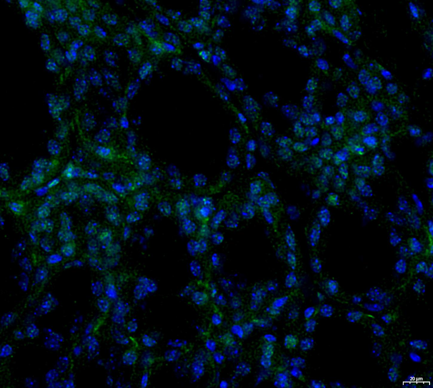 • Immunofluorescent analysis of Mouse thyroid tissue using F2699 (green, 1:50) and Hoechst (blue).