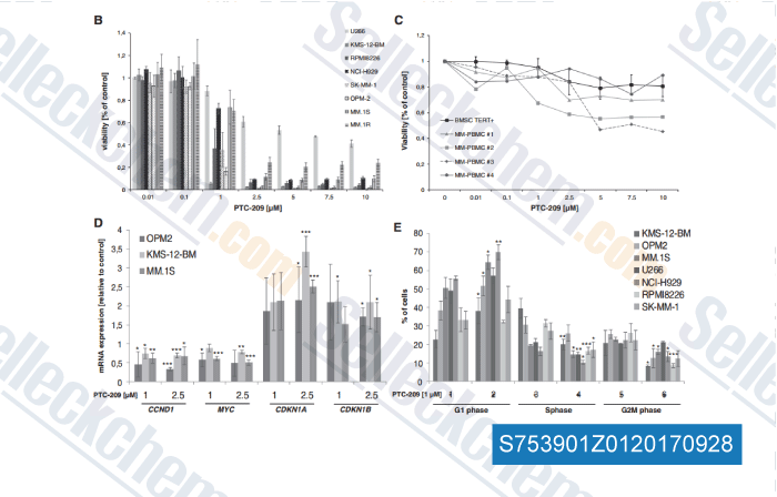 | 体外研究 | PTC-209抑制人结肠直肠HCT116和人纤维肉瘤HT1080肿瘤细胞中UTR介导的报告基因表达和内源性BMI-1表达。PTC-209以BMI-1依赖的方式减少结直肠癌肿瘤细胞的生长。此外,PTC-209通过不可逆生长抑制损害结肠直肠癌起始细胞(CICs)。[1] | ||