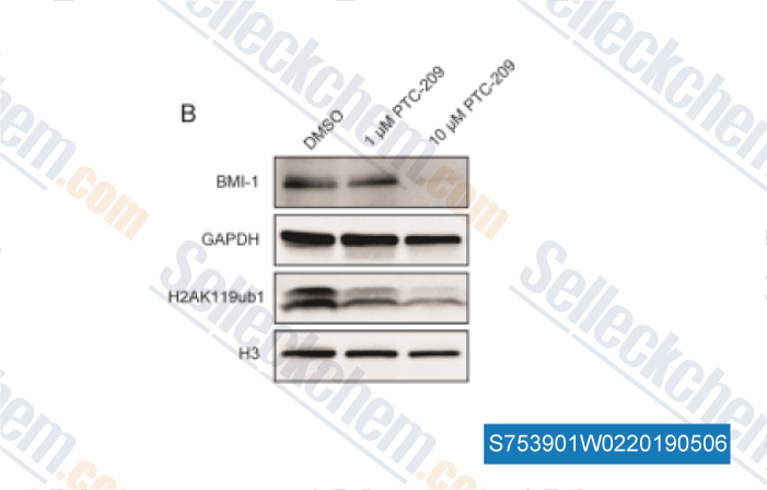 | 体内研究 | 在原代人结肠癌异种移植,人结肠癌细胞系LIM1215或HCT116异种移植的小鼠体内,PTC-209 (60 毫克/千克/天,皮下注射)有效抑制肿瘤组织中BMI-1产生,并使已产生的肿瘤停止生长。PTC-209也会减少体内功能性结直肠癌 CICs的频率。[1] | ||