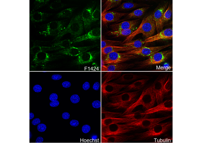 • Immunofluorescent analysis of C2C12 cells using F1424 (green, 1:800), Hoechst (blue) and tubulin (Red).