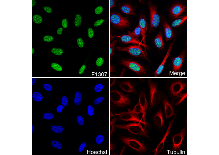 • Immunofluorescent analysis of Hela cells using F1307 (green, 1:50), Hoechst (blue) and tubulin (Red).