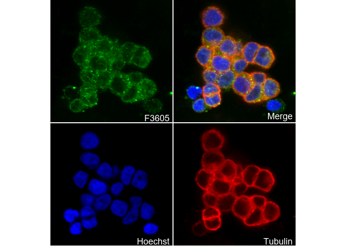 • Immunofluorescent analysis of A431 cells using F3605 (green, 1:100), Hoechst (blue) and tubulin (Red).