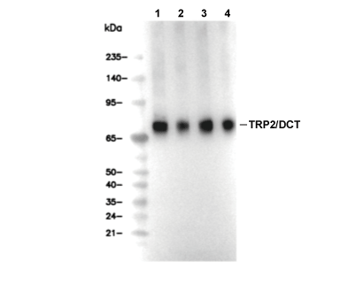 特异性 TRP2/DCT Antibody [K24G11] 可检测内源性 TRP2/DCT 总蛋白水平。
