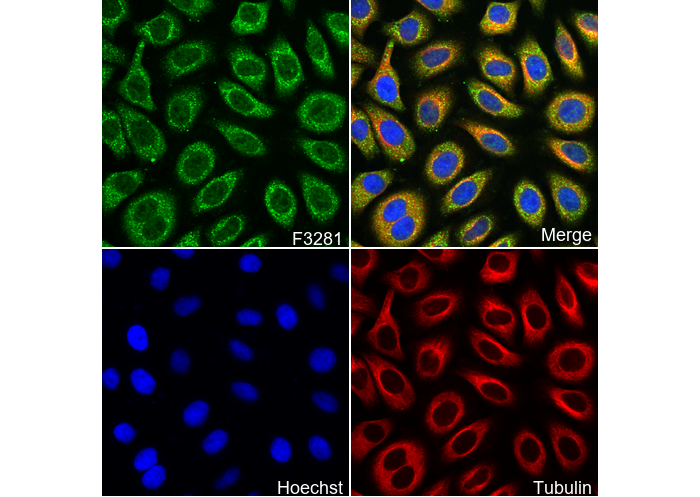 • Immunofluorescent analysis of MCF7 cells using F3281 (green, 1:50), Hoechst (blue) and tubulin (Red).