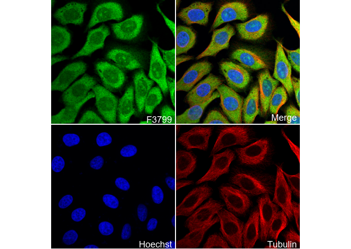 • Immunofluorescent analysis of MCF7 cells using F3799 (green, 1:50), Hoechst (blue) and tubulin (Red).